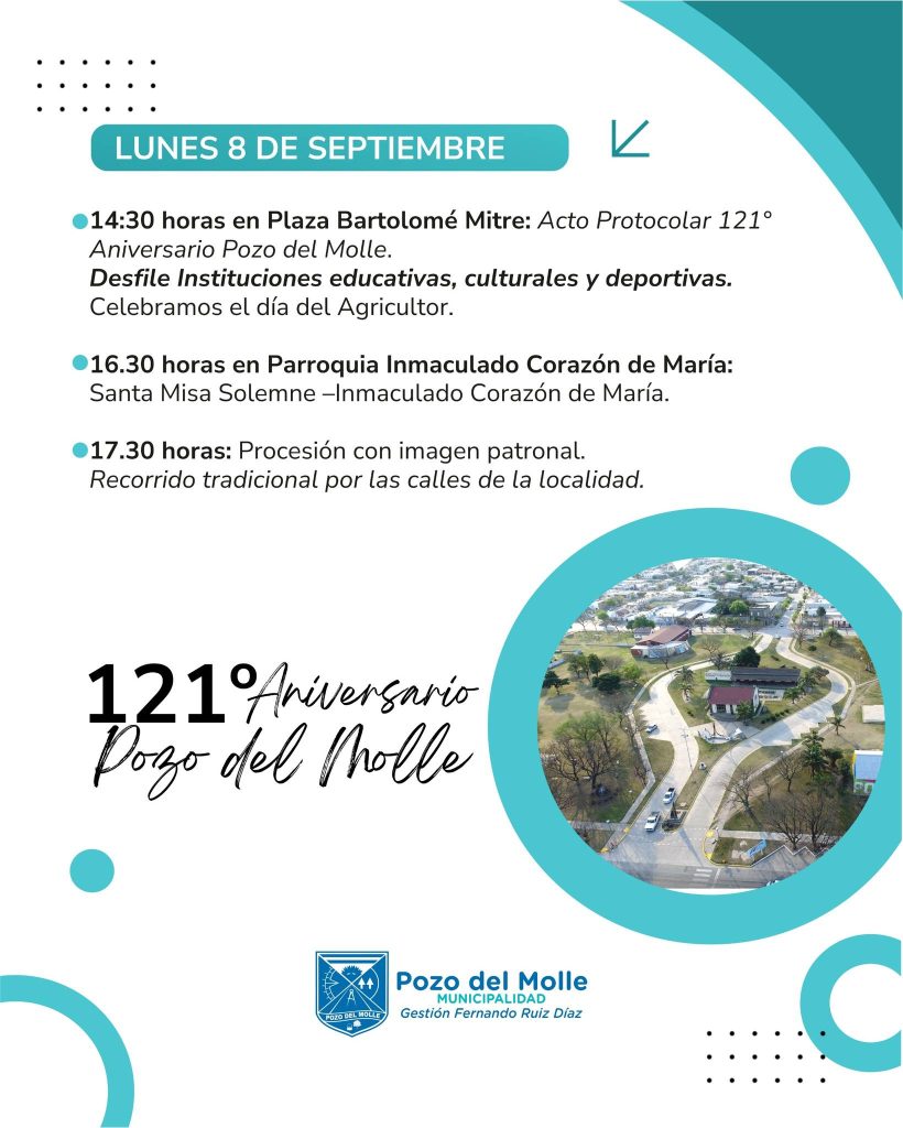 El lunes 8 se realizará el acto protocolar por el aniversario 121º de Pozo del Molle y la tradicional procesión, entre otras actividades.