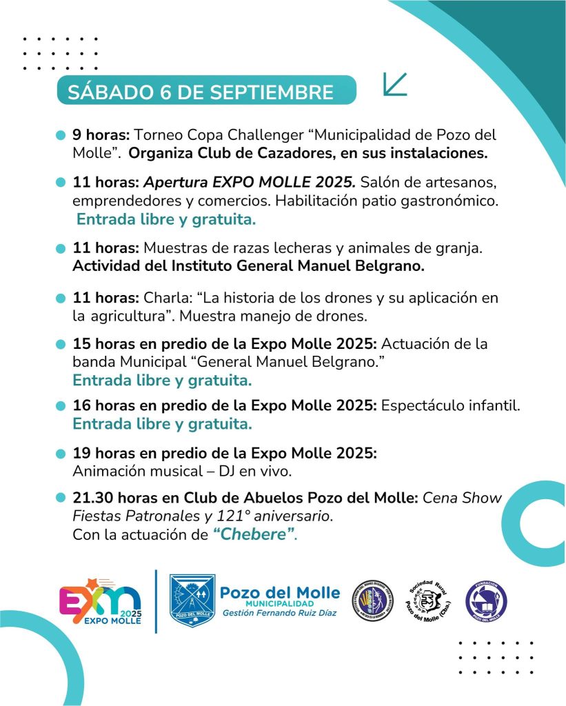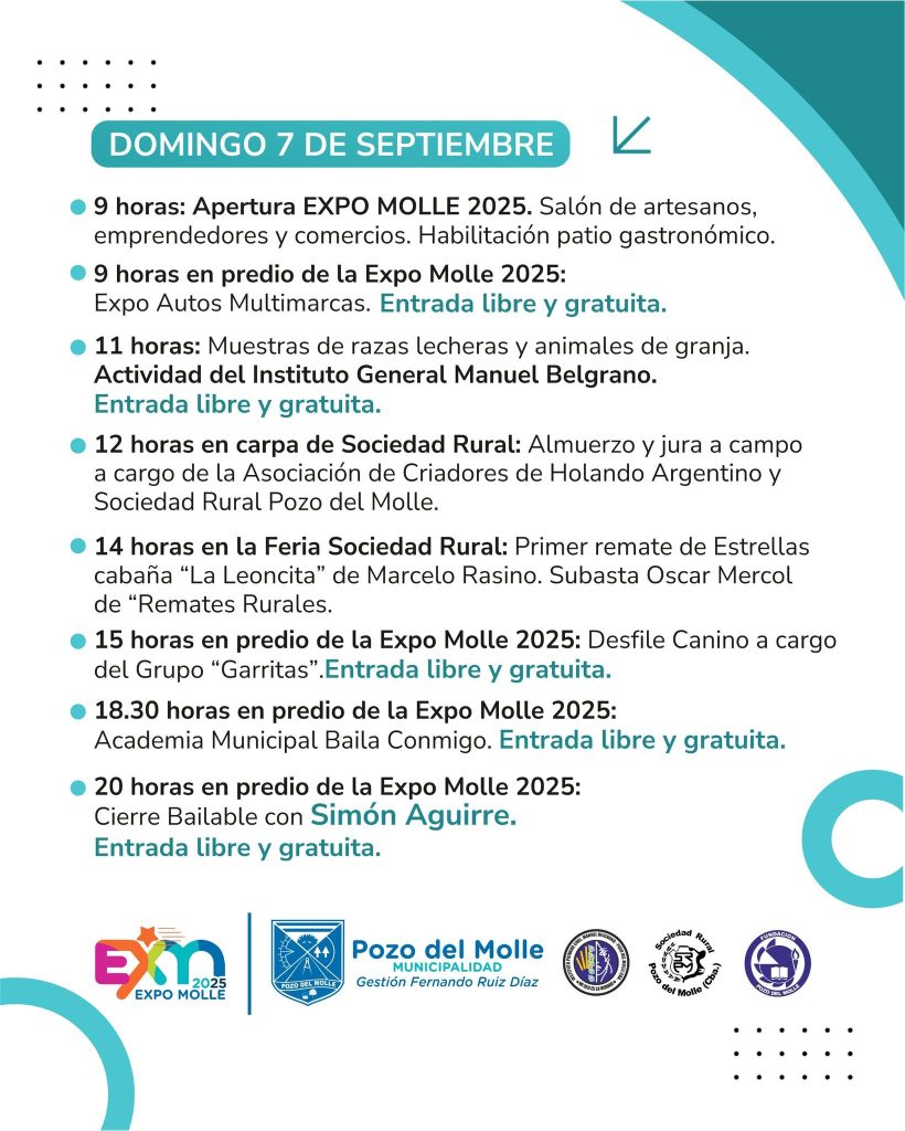El domingo 7 continuará la Expo Molle con diversas actividades, entre ellas, una exposición de autos Multimarcas, el primer remate de estrellas de cabaña “La Leoncita”, desfile canino y un cierre bailable con Simón Aguirre.